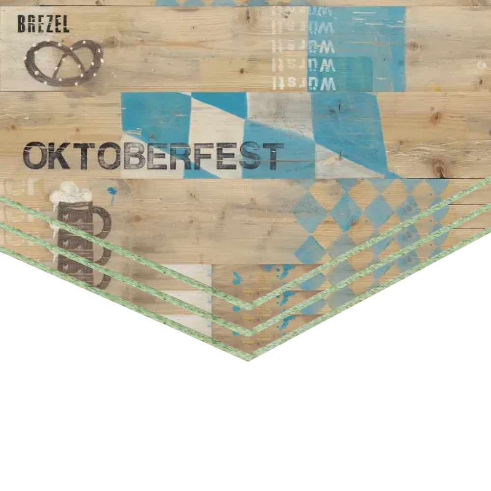 Декор строительной влагостойкой плиты Квик Дек Октоберфест способен качественно повлиять на любой интерьер помещения, будто придавая ему дух германского праздника и свободного веселья. Смелое сочетание нарочито грубой древесины, бокалов пива с бьющей через край пеной, кренделей и бело-голубых ромбов – всё это будто притягивает нас в круговорот песен, танцев и гастрономических вольностей.